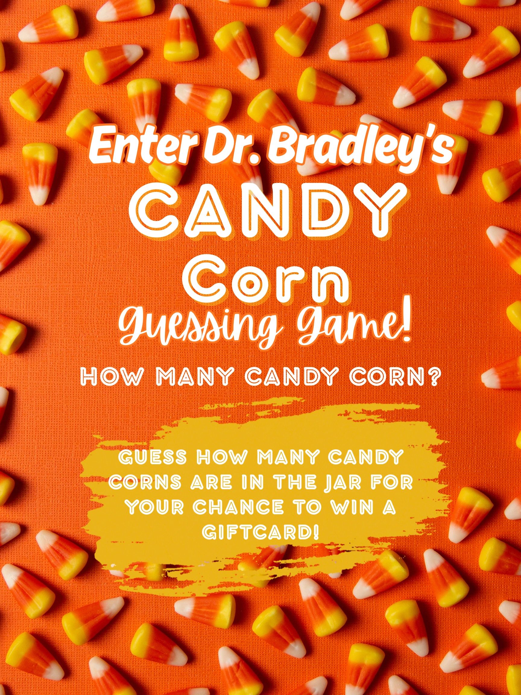 At your next visit, look for the mason jar filled with candy corn. How many are inside? Jot down your guess, full name, and phone number on a paper slip. Drop your entry in the glass bowl. Winners will receive a gift card of their choice!
